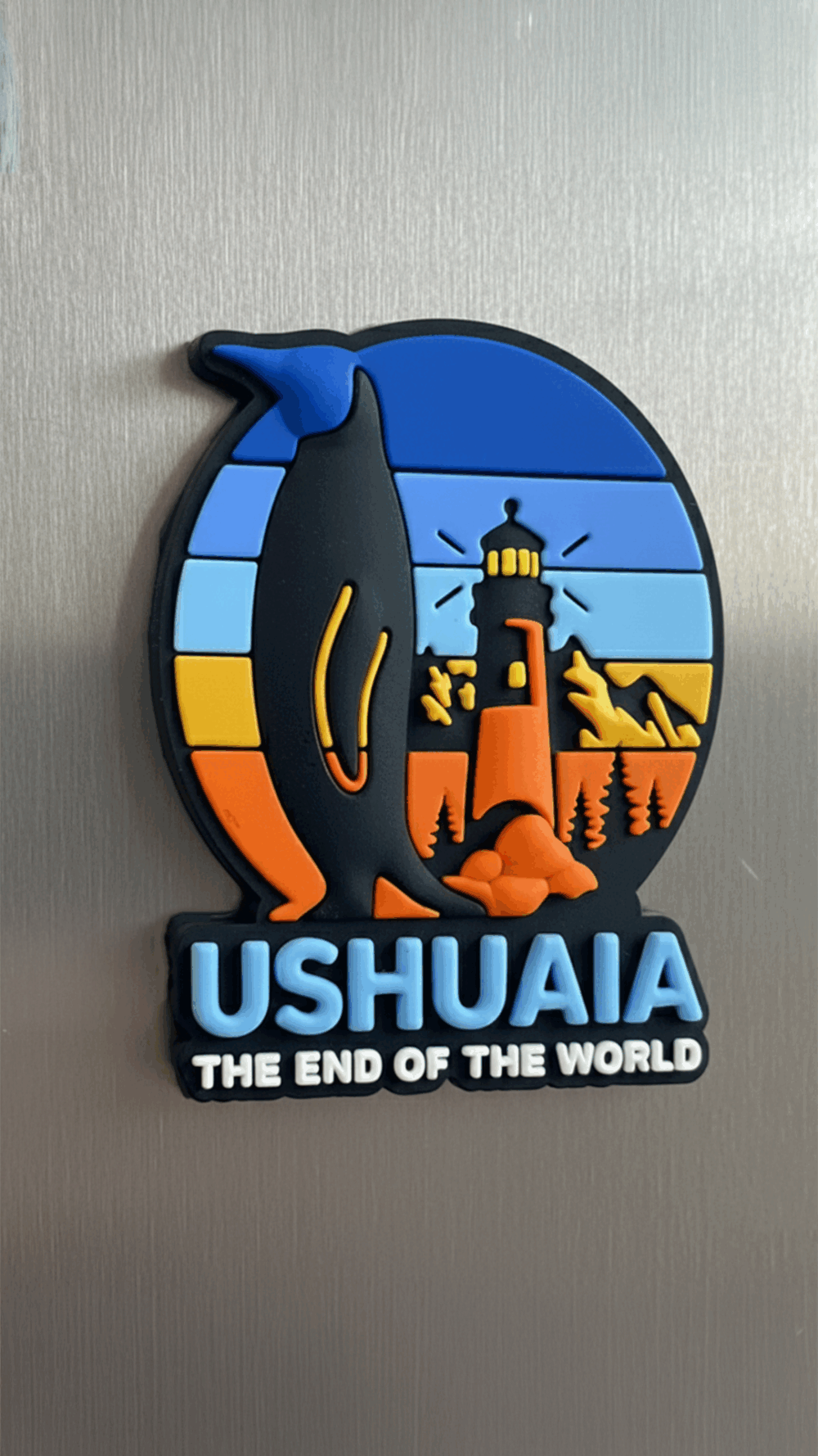 Este imán de Ushuaia – The End of the World presenta un diseño moderno y colorido que combina dos de los símbolos más representativos del fin del mundo: el pingüino y el faro.